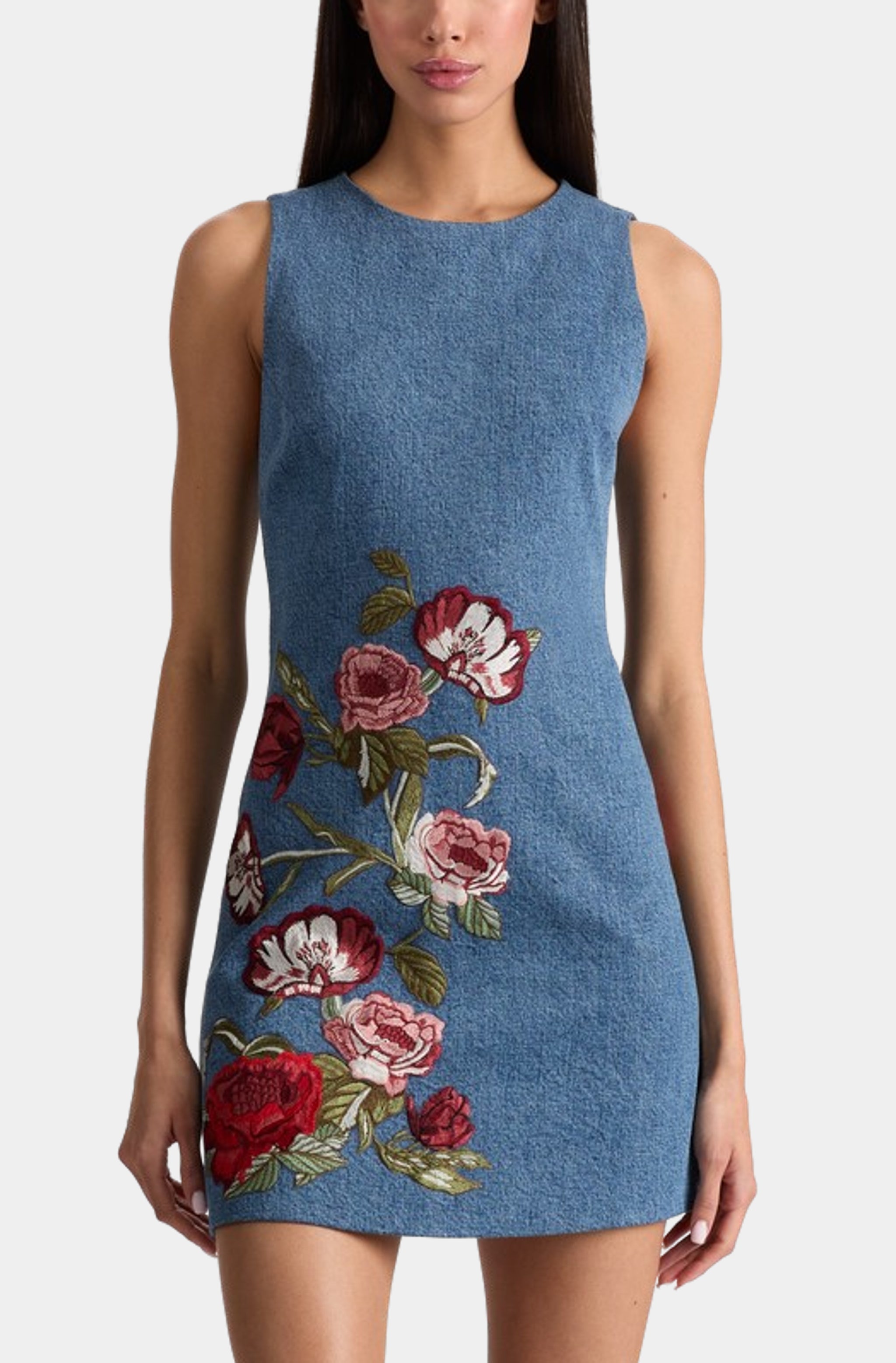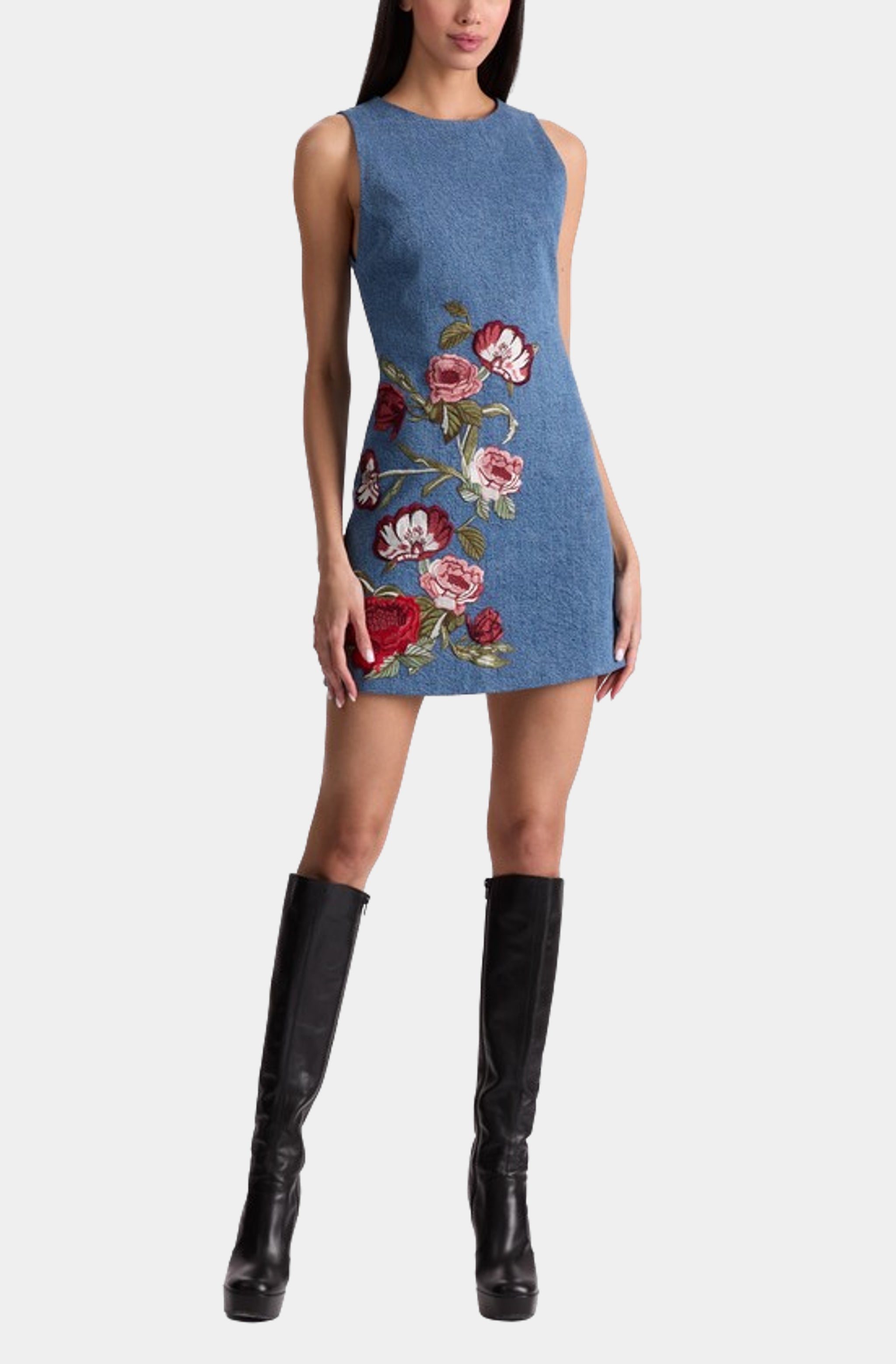 Alice & Olivia Cade Embroidered Sleeveless Shift Denim Mini Dress